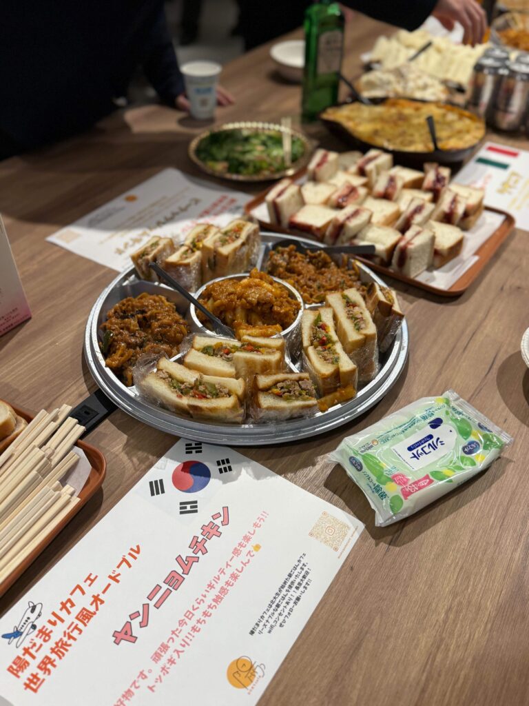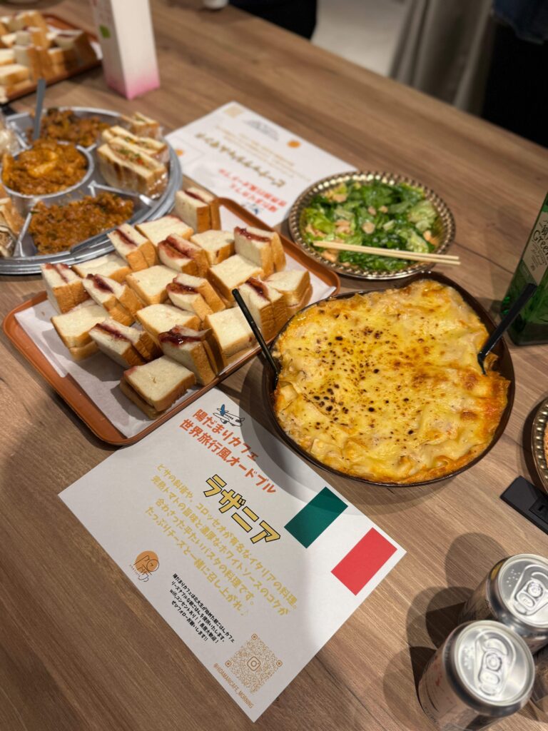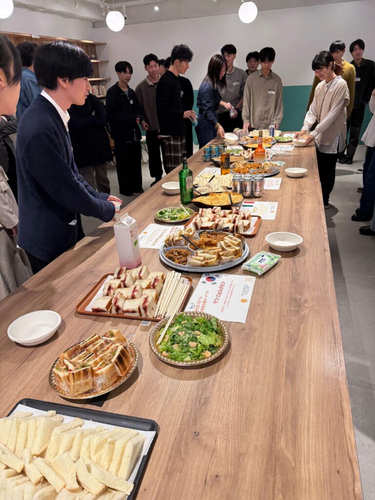 3. 懇親会:ラザニアやチーズダッカルビなど、さまざまな料理が並ぶ立食形式でフリートークを実施。